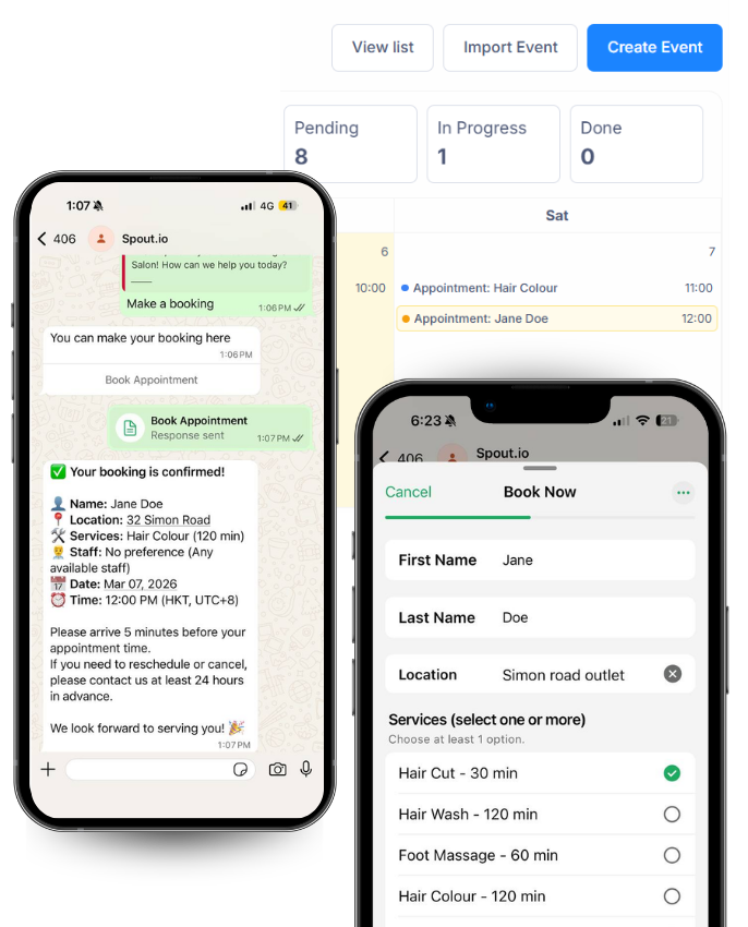 Our platform connects WhatsApp conversations directly to your booking and calendar system, eliminating manual scheduling, missed messages, and double bookings.