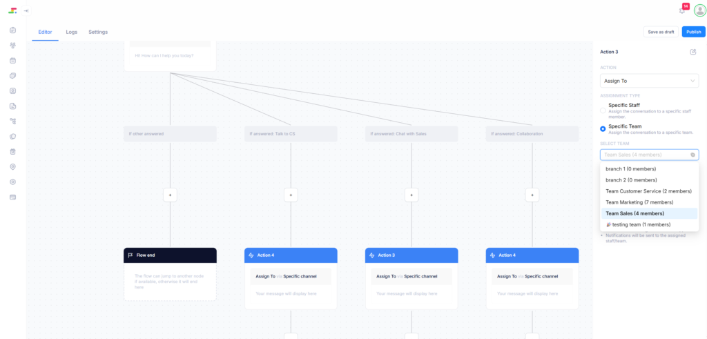 Chats can be automatically routed based on workflow rules, customer selections, or enquiry types. For example, sales enquiries can go to the sales team while support questions are directed to customer service.