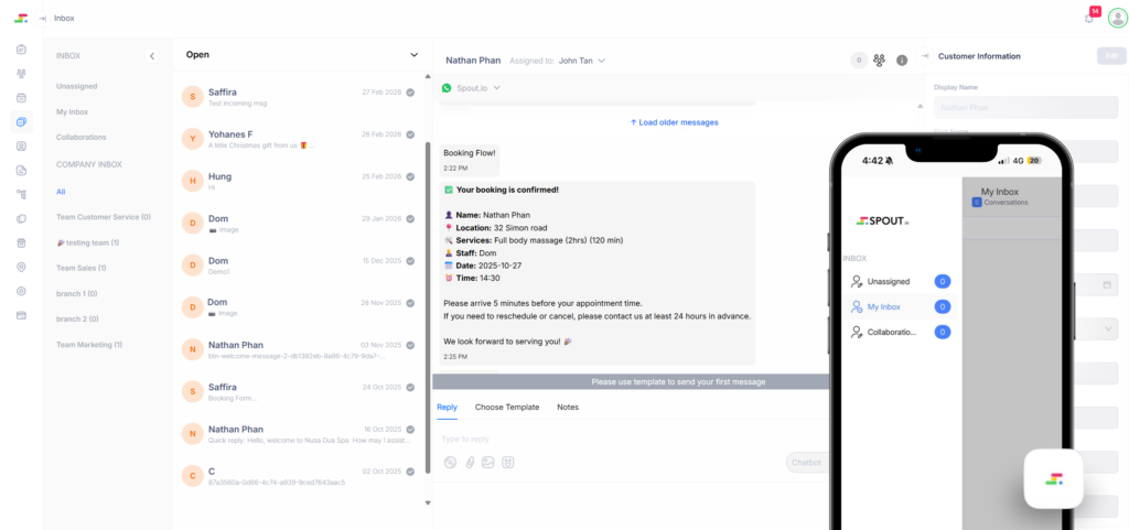 Your entire team can manage conversations from the same WhatsApp business number through Spout.